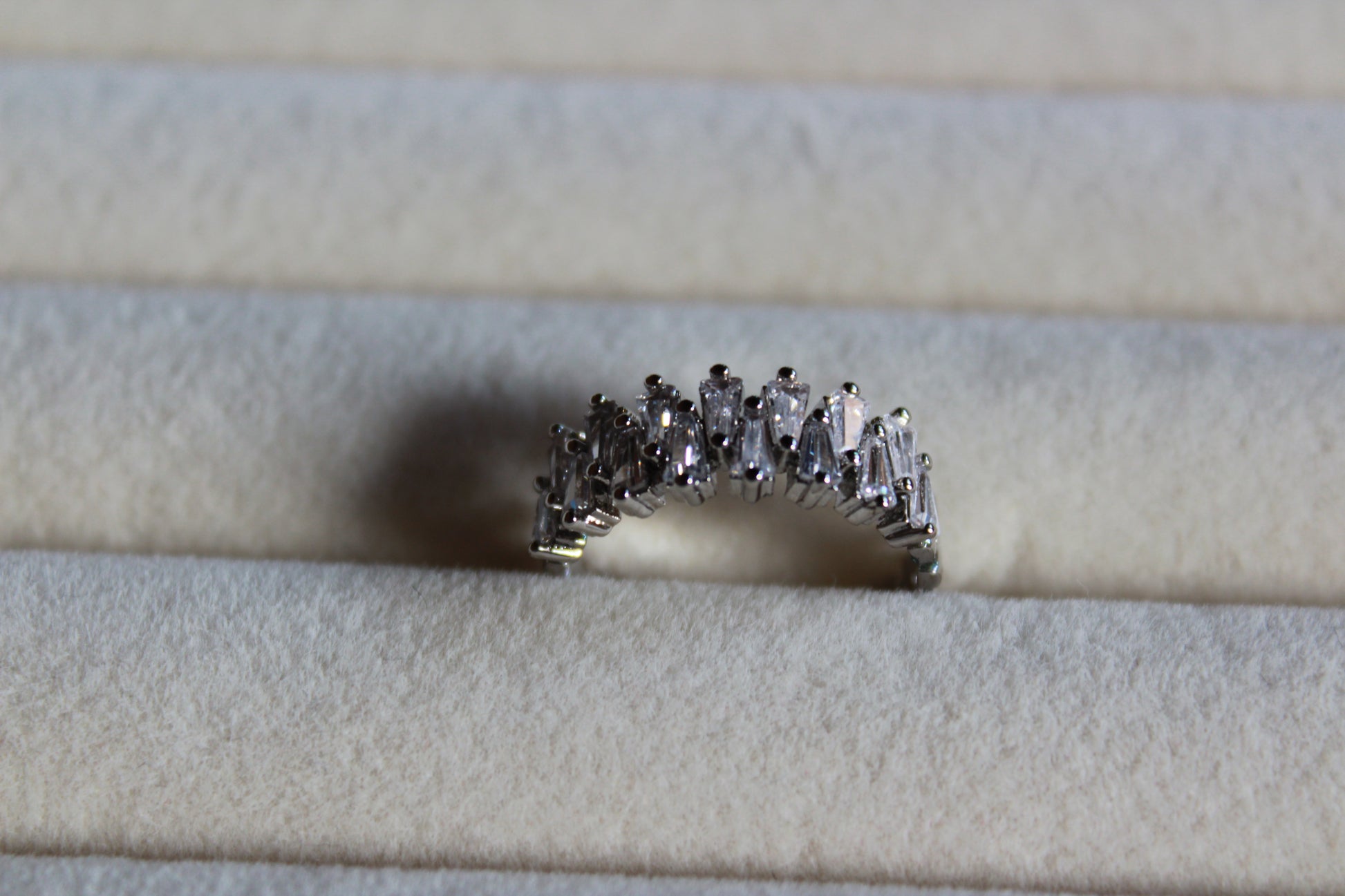 The Damla ring is a stunning piece crafted from durable stainless steel, fully adorned with silver diamonds in a unique pattern that adds a touch of elegance and sophistication. This adjustable ring ensures a perfect fit and stands out as a chic and refined item, making it ideal for special occasions. Its exquisite design pairs beautifully with the Aurora bracelet, creating a coordinated, elegant look that will elevate any outfit.