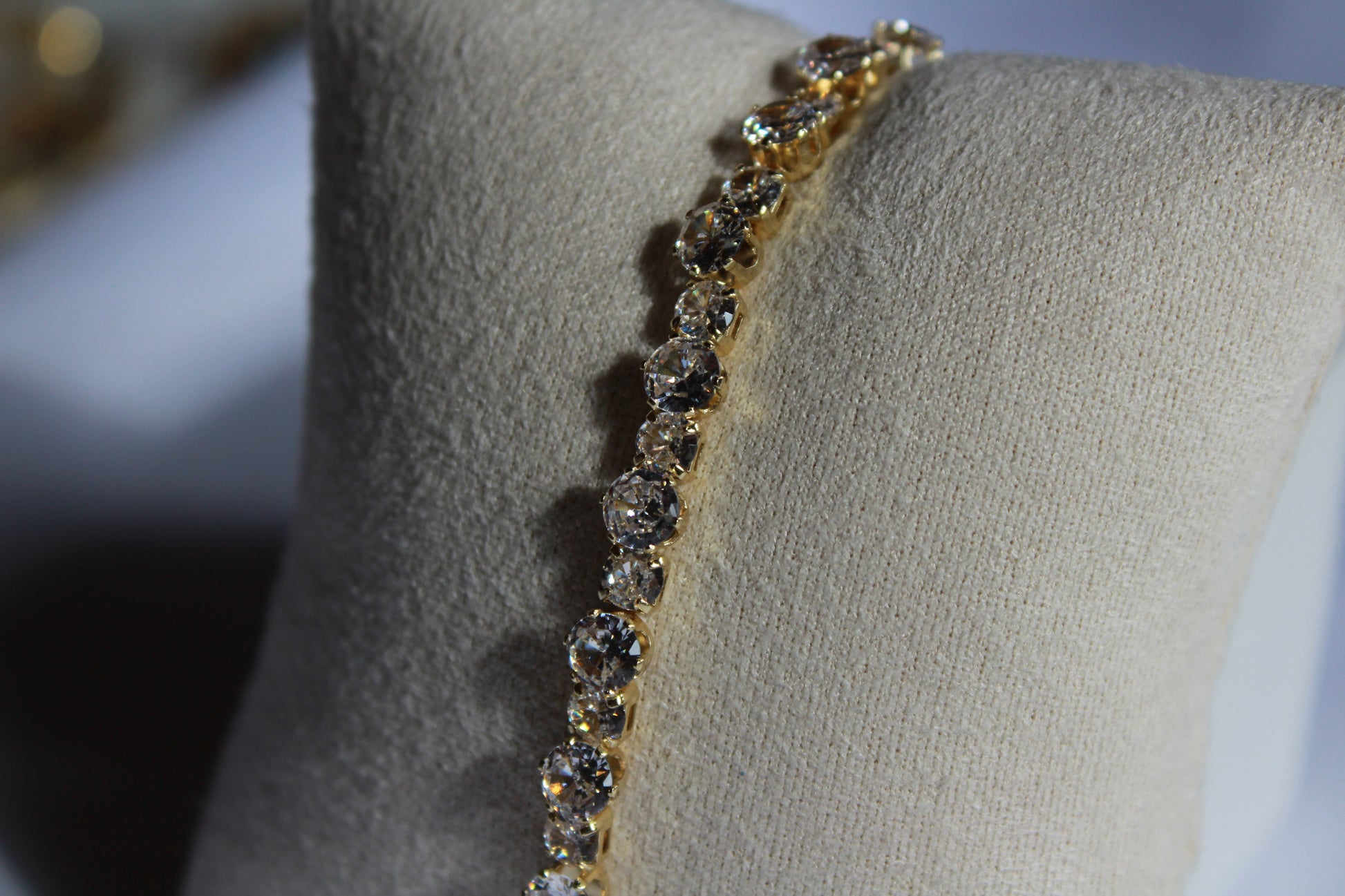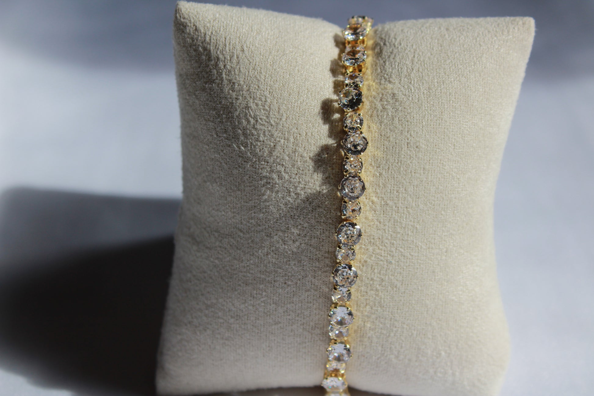 The Elysia is a refined tennis bracelet, crafted from 18K gold plating and set with AAA cubic zirconia stones in varying sizes for a truly elegant sparkle. Measuring 16 cm in length with an additional 3 cm extension, it offers a comfortable and adjustable fit.