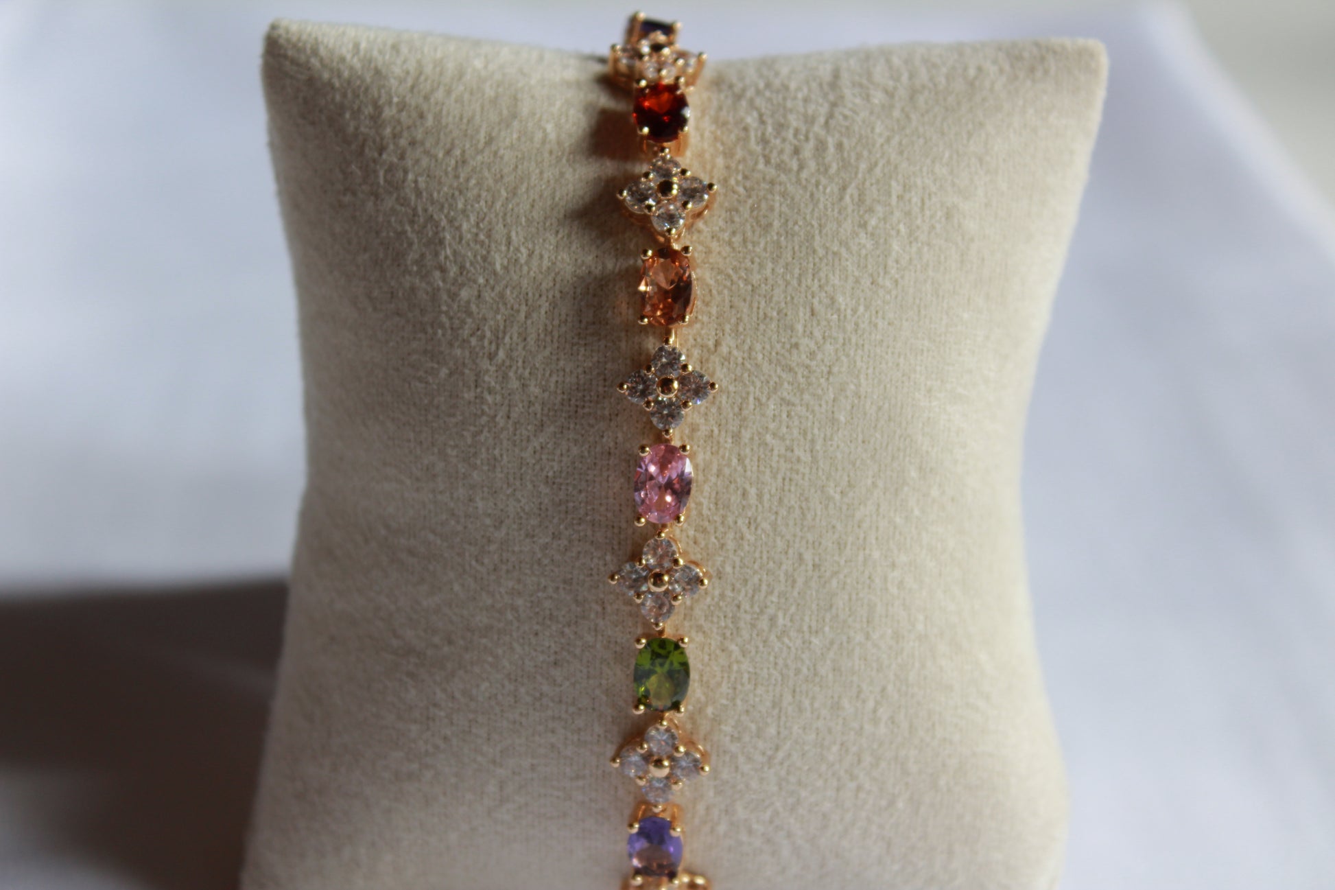 This exquisite 18k gold bracelet features a stunning array of AAA cubic zirconia stones in a beautiful blend of pink, green, red, and purple. The vibrant mix of colors makes this piece perfect for both everyday wear, adding a pop of color to your outfit, and special occasions, where it will truly make your look shine. The bracelet measures 19 cm in length, with an additional 4 cm extension for a perfect, adjustable fit, making it an ideal choice for any occasion.