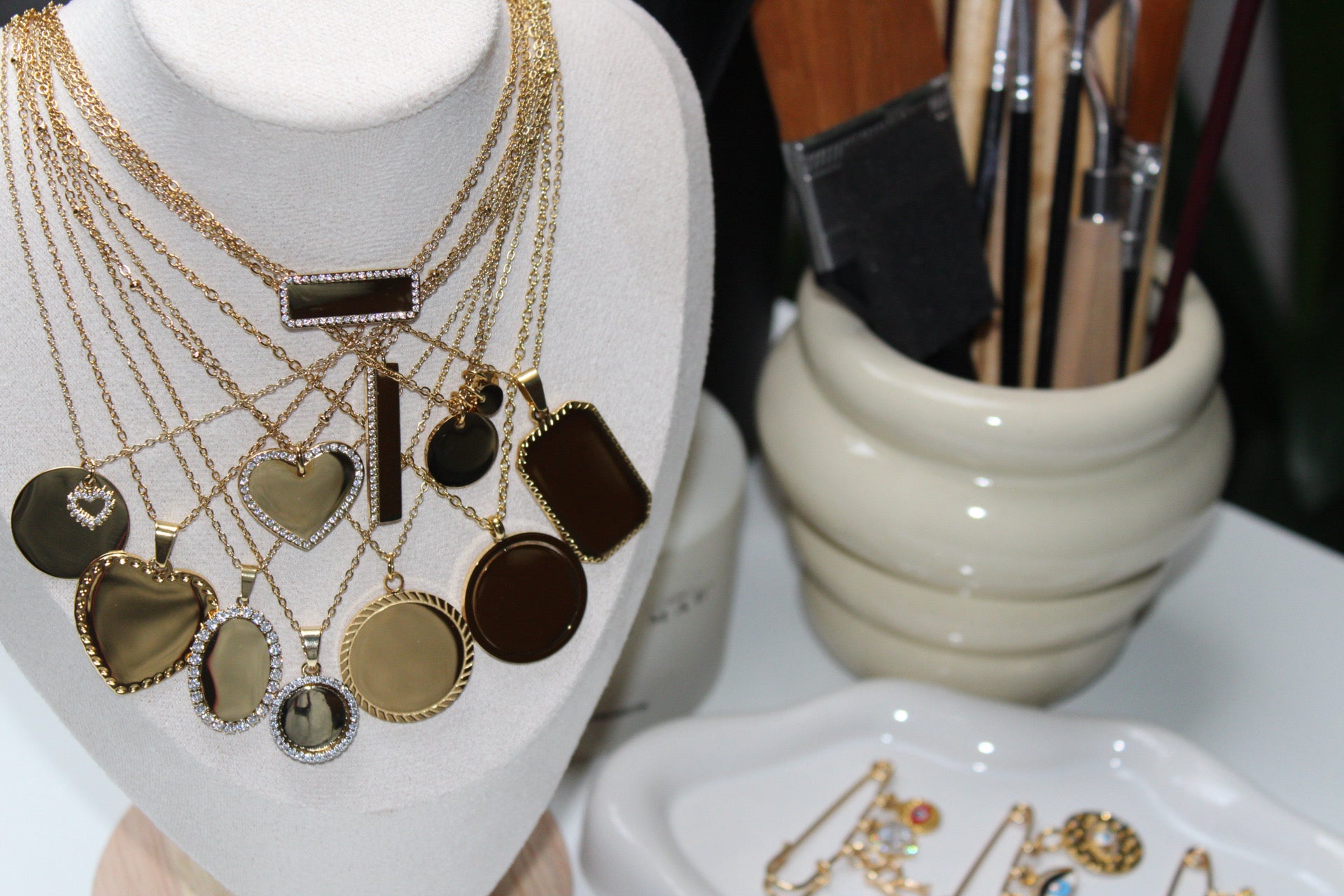 A chic and timeless heart shaped necklace featuring sparkling diamonds along the edges of the front and a smooth gold back. Personalize both sides with initials, dates, or special symbols for a truly elegant and unique piece.