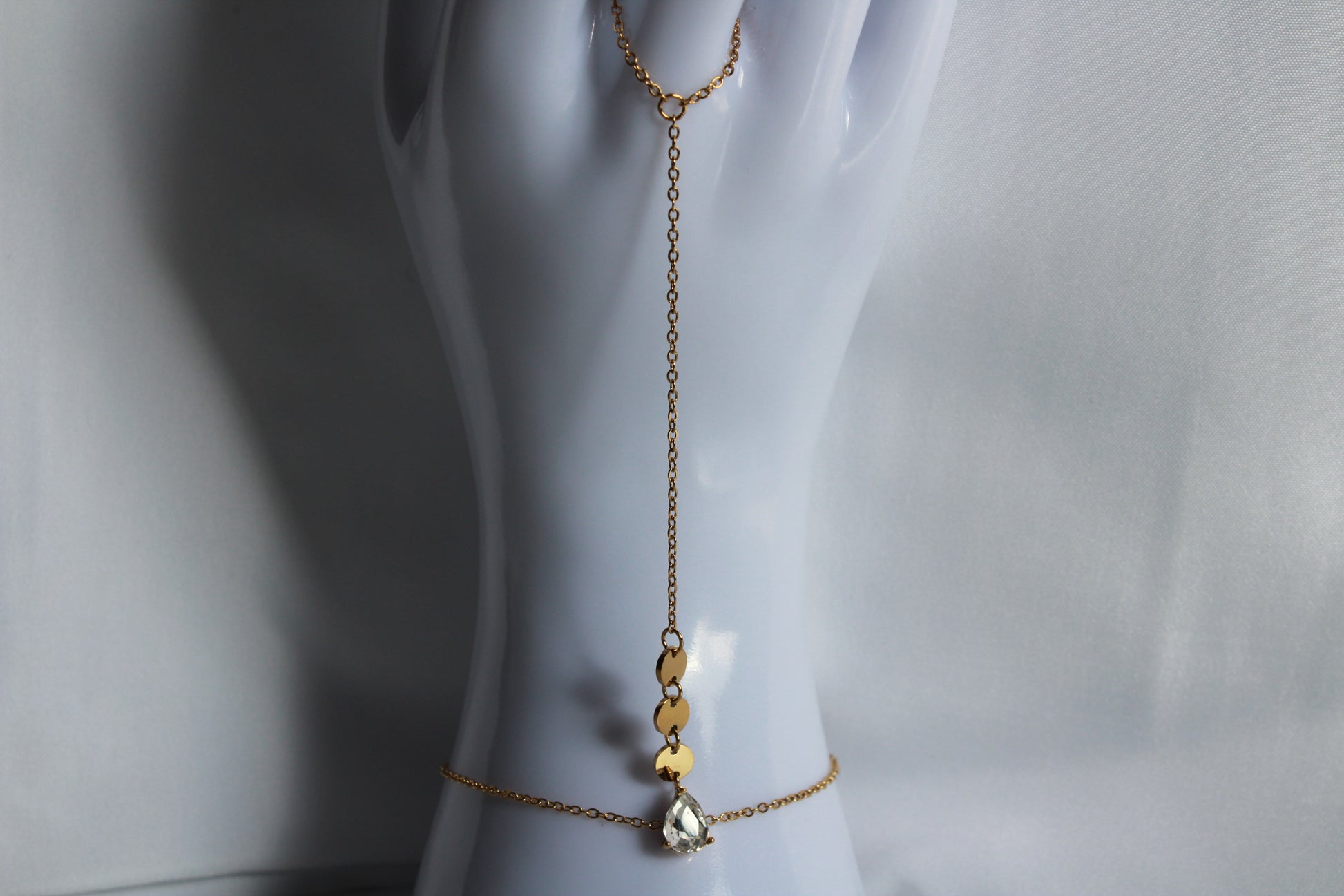 The Niya hand chain is a stunning, trendsetting piece that combines elegance with modern style. Made from durable stainless steel, it's perfect for everyday wear and special occasions. The Niya features a beautiful diamond stone, adding a touch of sophistication and making it ideal for more formal settings. This chic hand chain immediately draws attention and can be effortlessly paired with different bracelets to create a layered, personalized look. A must-have accessory that adds both sparkle and elegance to any outfit.