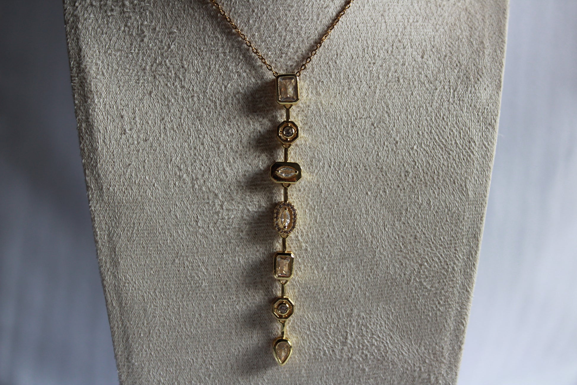 The Valoria is a striking Y-shaped necklace, designed to fall gracefully along the neckline and accentuate the décolleté. Crafted from high quality stainless steel, it is adorned with a mix of beautifully shaped stones that add a touch of sparkle and elegance.